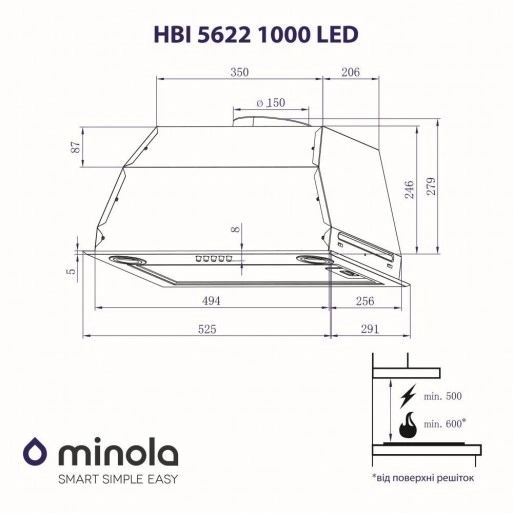 Повновбудована кухонна витяжка Minola HBI 5622 1000 LED оснащена одним моторам потужністю 200 Вт. Максимальна продуктивність приладу в режимі відведення повітря становить 1000 м ³ / год, що дозволяє ефективно видаляти випаровування, небажані запахи та кіптяву, які утворюються в процесі приготування їжі.