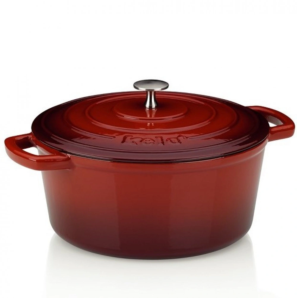 Круглая чугунная кастрюля с крышкой диаметром 24 см и объемом 4 литра. Красная кастрюля изготовлена из чугуна и покрыта эмалью бежевого цвета внутри, имеет глянцевое покрытие. Она идеально подходит как для обжарки (до 300°C), так и для продолжительного тушения мяса в собственном соке. Подходит для всех источников тепла, включая индукционные.