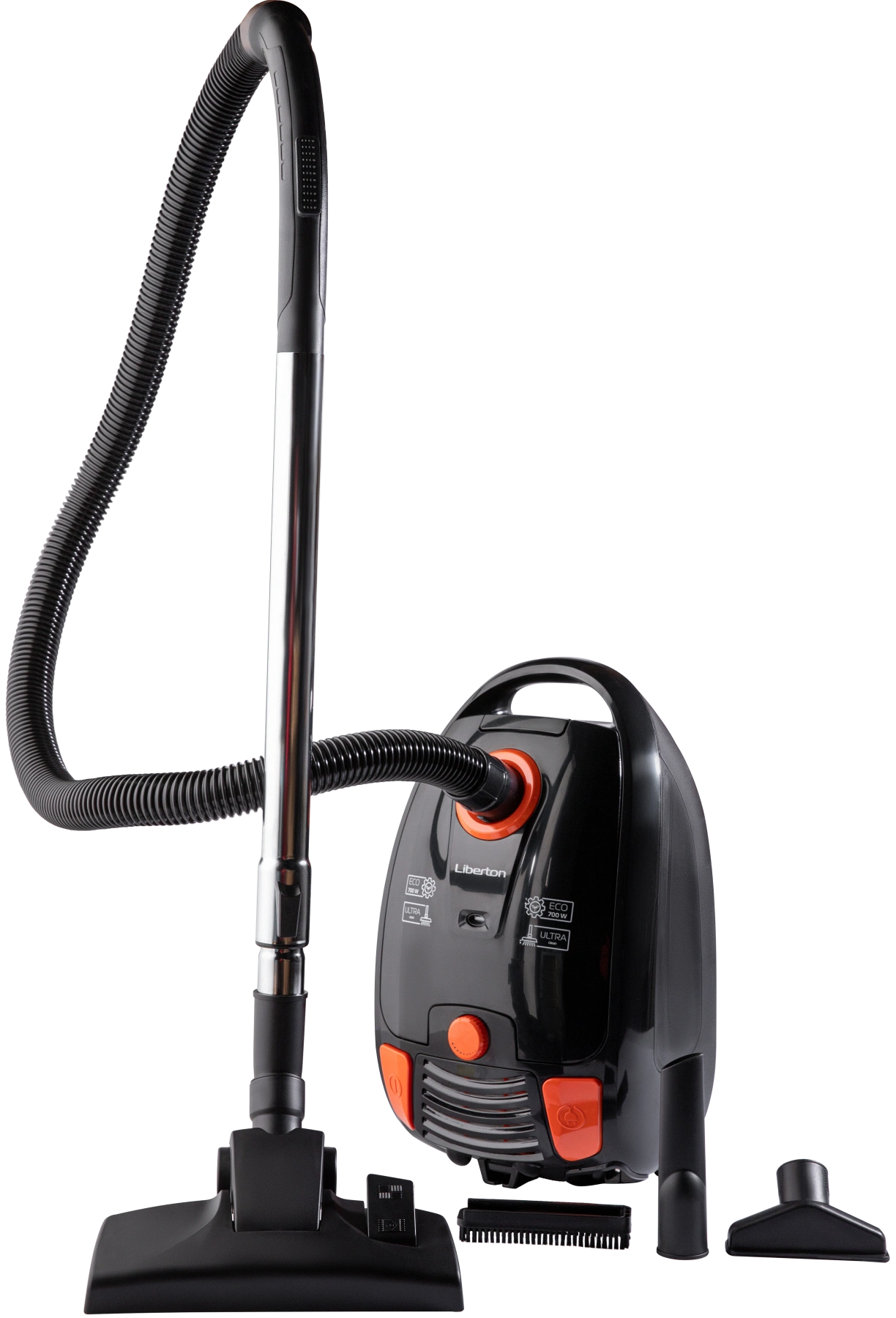 Мощность: 700 Вт; Тип: мешковой; Объем пылесборника: 3,5 л; Комплектация: телескопическая хромированная трубка, насадки пол/ковер/щель, шнур 5,2 м; Фильтр: HEPA,синтетическая губка; Опции: поворот шланга на 360 градусов, регулятор мощности; Размер изделия: 43,8х26,8х24,5 см; Цвет: черный.