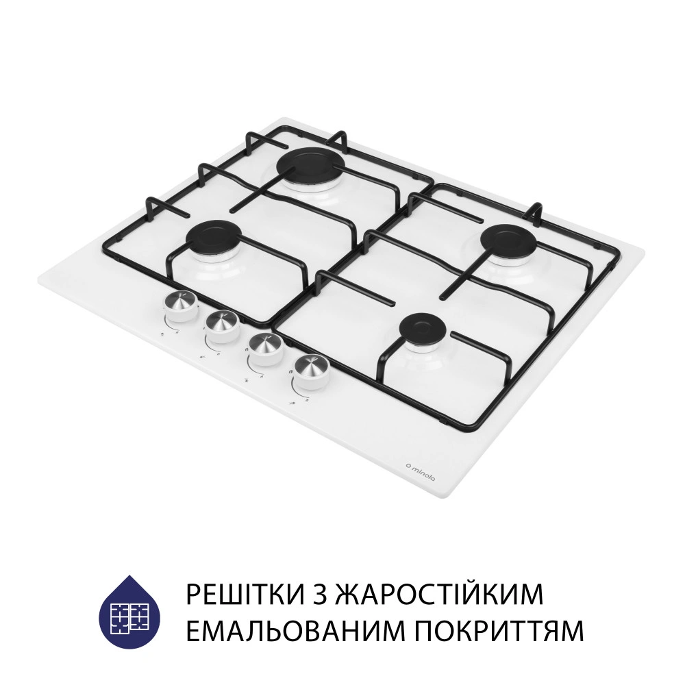 В газовой поверхности на металле Minola MGM 61404 WH гармонично сочетаются элегантность и практичность. Модель оборудована четырьмя конфорками разной мощности, а ее ширина составляет 61 см.