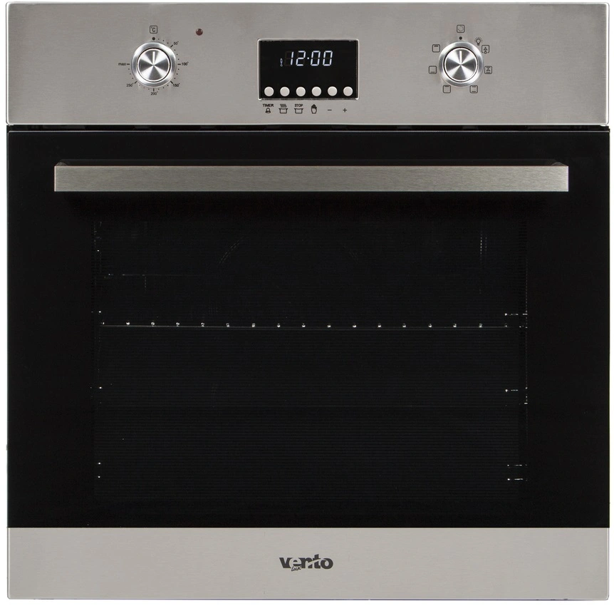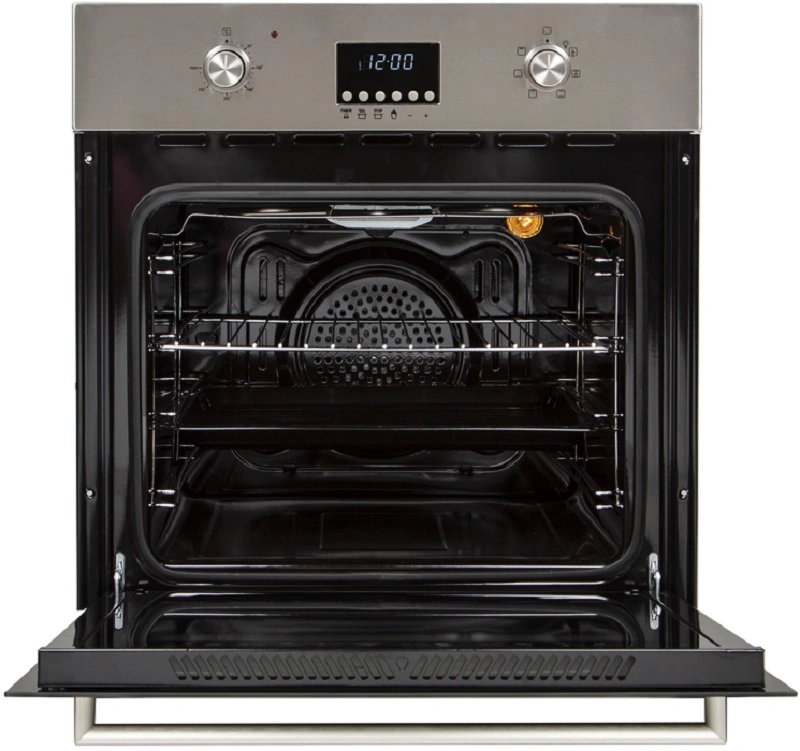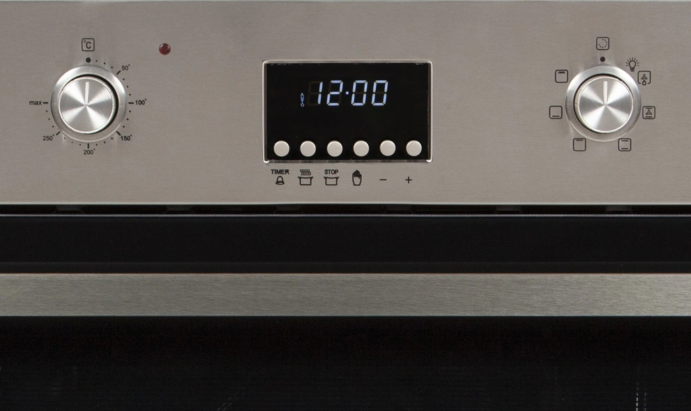 Управление осуществляется утапливаемыми поворотными ручками и мягкими кнопками, расположенными под цифровым дисплеем. На дисплее отображается реальное время, а также с его помощью программируется таймер, который отключит духовку по истечению указанного времени.