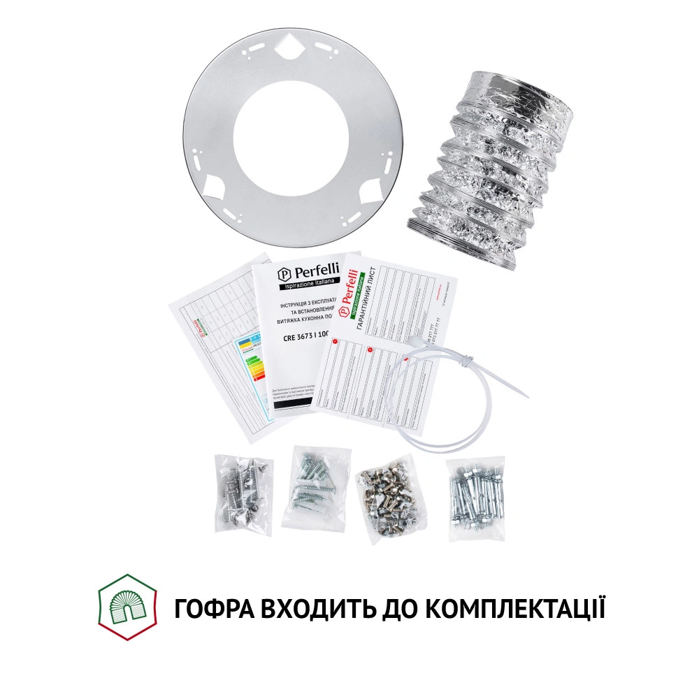 | Комплектація | Витяжка Монтажний комплектГофраМеталеві планкиЕнергокартаМікрофіша Гарантійний талон Інструкція |